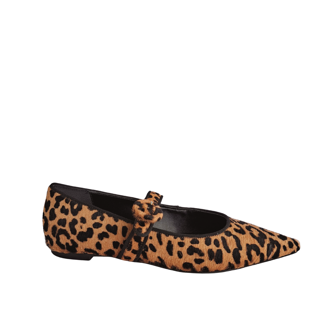 Descrição : Sapatilha em couro com estampa animal print, tem cabedal arredondado e bico fino, traz uma tira larga no peito do pé com fechamento fivela redonda forrada no mesmo material, traz tira gorgurão no acabamento. Tem salto baixo, palmilha preta com inscrição da marca.