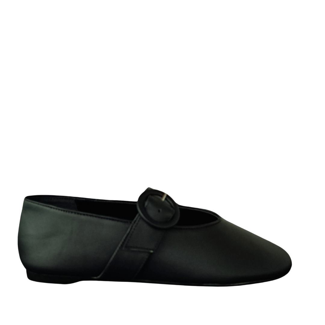 Descrição : Sapatilha boneca preta em couro com salto baixo. Cabedal em formato arredondado, traz uma tira larga sobre o peito do pé com fechamento em fivela redonda forrada do mesmo material, o bico é redondo e a palmilha na cor preta traz a inscrição da marca.